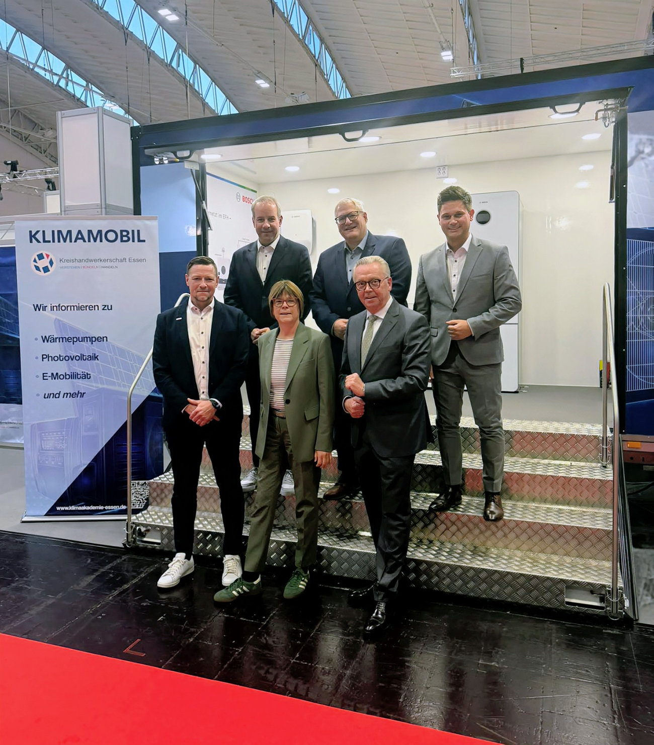 Verbraucherinnen und Verbrauchern anschaulich zeigen, worauf es bei der Energie- und Wärmewende im eigenen Heim ankommt? Zugleich dem Nachwuchs im Handwerk vor Augen führen, mit welchen modernen Technologien man mit Start der Ausbildung zu tun hat? Hierzu hat die Klima-Akademie der Kreishandwerkerschaft Essen in diesem Jahr in Zusammenarbeit mit der Firma Bosch Thermotechnik und der Stadt Essen einen mobilen Messe- und Informationsstand beschafft. An diesem wird zur energetischen Sanierung, Photovoltaik, Wärmepumpe, Klimasplit-Gerät, Wallbox und mehr informiert. Interessierte Jugendliche können sich zudem über den Einstieg ins und die Karrierewege im Handwerk schlaumachen. Immobilienbesitzerinnen und -besitzer können sich zur Wärme- und Energiewende in ihrer Liegenschaft informieren lassen.