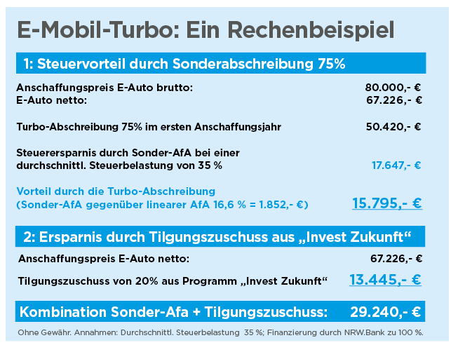 - Vollelektrische Firmenfahrzeuge werden durch eine Turbo-Abschreibung gefördert: Im Anschaffungsjahr können 75 % sofort abgeschrieben werden – das mindert die Steuerschuld und schafft so Liquidität für Investitionen.
